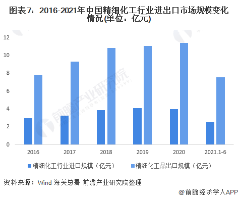 進口規模方面。2016-2020年中國精細化工進口規模逐年上升,但增幅有所縮減。2020年受疫情影響,進出口貿易受阻,精細化工品規模達到4億元。2021年1-6月進口規模已經超過2.5億元,有望超過2020年規模恢復疫情前水平。