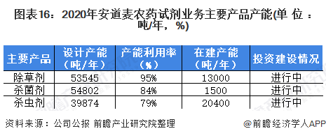 當前農藥試劑行業發展較為成熟,由於國內市場趨於飽和,因此絕大部分產能用於出口,通過小型和大型公司銷往海外市場。以當前業內領先企業安道麥為例,2020年安道麥精化農藥業務主要產品產能利用率均達到79%及以上,其中除草劑產能利用率更是達到95%,公司的產能穩步且規模較大,業務成熟度高。