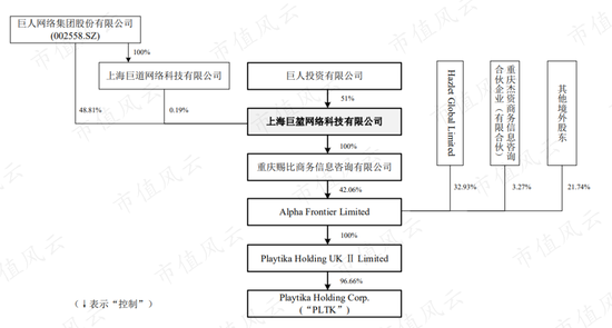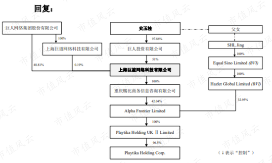 這筆凍結的股權關係鏈是這樣的,史玉柱擁有巨人投資近100%股權,巨人投資通過巨堃網絡控制了Playtika的大部分股份。