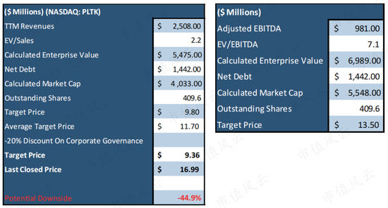 根據企業價值/營收和企業價值/EBITDA的中位數,我們計算出Playtika的目標價格為每股9.36美元,較當前交易價格有44.9%的下跌空間。