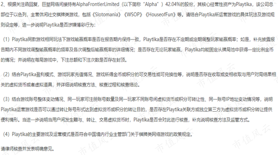 巨人網絡的回覆函中表示,Playtika的遊戲不從事賭博活動,主要是因為遊戲玩家沒有權利獲得任何有價值的物品。然而在中國證監會的后續調查中,提出了更詳細的問題。