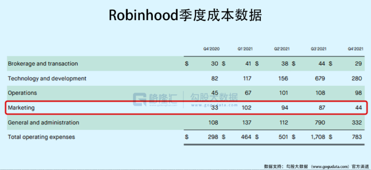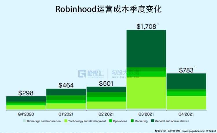 運營成本大幅超過營收(Q4運營成本7.83億vs營收3.63億),短期內Robinhood仍看不到盈利的可能性。另外,近兩個季度可以看到其中管理成本在大幅上升,主要是股權激勵帶來的影響。