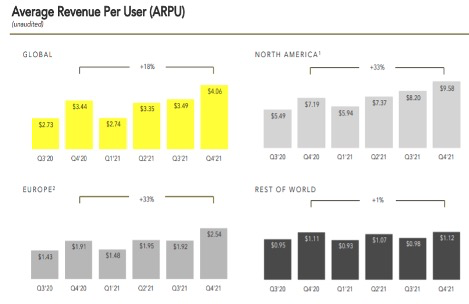 從每用户平均收入來看,Snap也保持穩步向前的步伐。本季度,用户平均收入達到4.06美元,同比增長18%,其中北美和歐洲地區表現亮眼,均達到30%以上的同比增長。