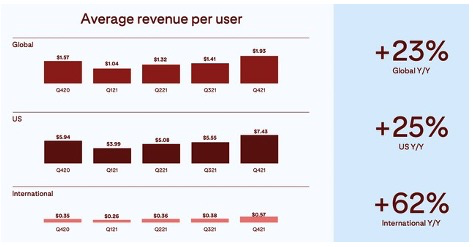 第四季度,Pinterest實現營收8.47億美元,與上年同期的7.06億美元相比增長20%,調整后每股攤薄收益為0.49美元,都超過了市場預期。説明Pinterest本季度並沒有受到蘋果隱私新規和宏觀經濟環境等不利因素的影響,穩住了自己合作方和收入渠道。