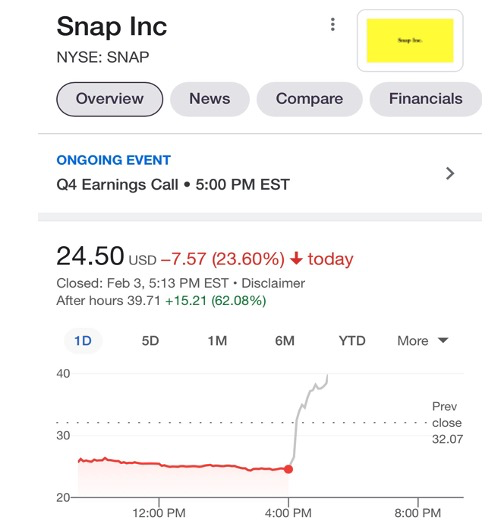 上周三,Meta的盤后暴跌曾給美國的整個社交媒體板塊帶來了巨震,人們都以老大Meta為風向標,認為一眾社交媒體都會在本季度集體落水。其中,Meta的老對手Snap更是被直接嚇到暴跌約24%。