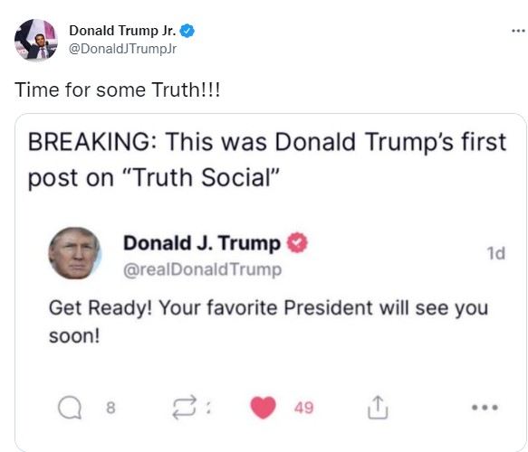 據悉,特朗普的兒子小唐納德·特朗普在推特上發佈了這位前總統在TRUTH Social上發佈的第一個帖子的截圖:「做好準備,你最喜歡的總統很快將見到你!」