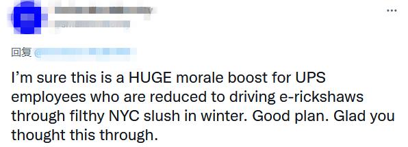 「我相信這對UPS員工來説是一個極大的士氣鼓舞,他們不得不在冬天開着電動三輪車在紐約骯髒的泥濘中穿行,真是干得漂亮啊。」