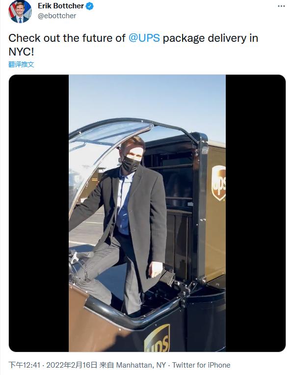 昨天(16日),美國紐約市議員Erik Bottcher發佈了一則視頻引起中美兩國網友的熱議。視頻中,他騎着一輛印有美國聯合包裹運送服務公司(UPS)標誌的腳踏電動三輪車,介紹稱UPS將用這款快遞車替代部分運貨卡車在紐約投入使用,高呼道「這就是紐約快遞的未來!」