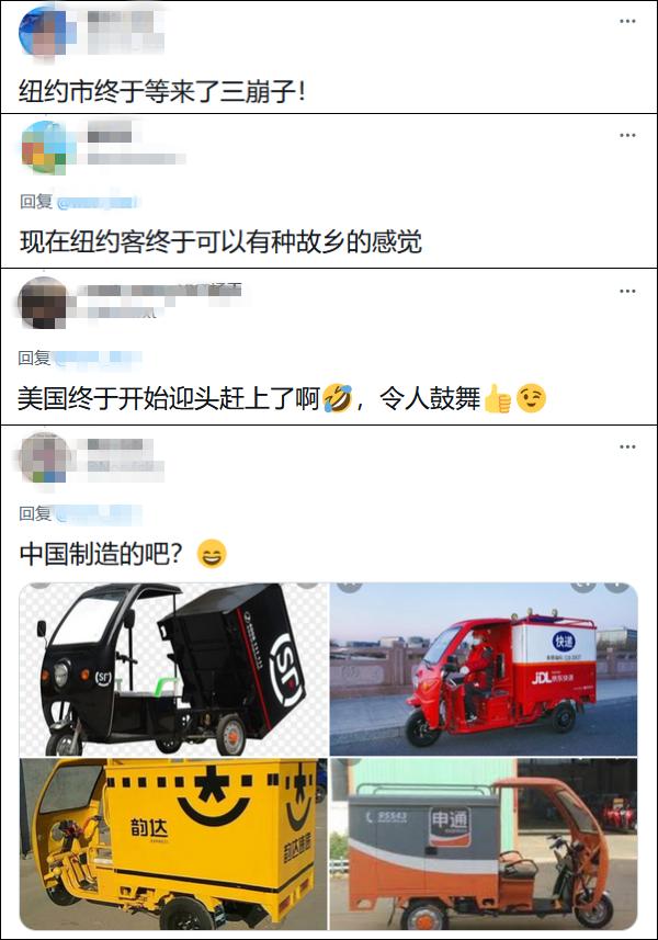 看到這輛非常眼熟的三輪車,中國網友樂了,「這不就是三蹦子嗎?」「原來我們早生活在美國人所憧憬的未來了」;而美國網友破防了,「中國一百年前就在用的東西,在紐約這兒就變未來了?」