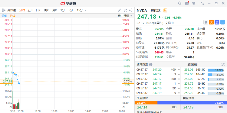 英偉達低開低走,截至發稿,該股跌近7%,股價報247.18美元,成交額46.35億美元。英偉達Q4及全年收入創新高。但有分析稱,市場對英偉達財報寄予希望過大,業績僅小幅高於或者符合預期可能反而令股價下跌。