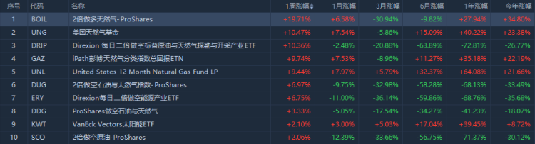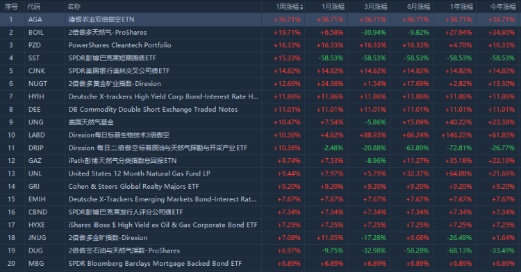 其中,2倍做多天然氣-ProShares大漲近20%,SPDE彭博巴克萊短期國債ETF漲超15%。