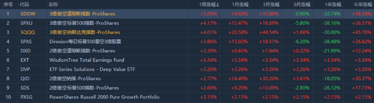 美股指數ETF方面,3倍做空道指的ETF $SDOW 本周漲5.09%,位居第一;3倍做空標普500指數的ETF $SPXU 、3倍做空納斯達克指數-ProShares $SQQQ 本周均漲超4%,分列第二、第三。