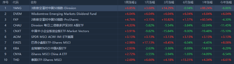 本周與A股市場相關的ETF表現較好,其中Direxion每日二倍做多滬深300A股ETF $CHAU 漲超4%,中國中小企業板創業板ETF $CNXT 漲近4%,金瑞博士MSCI中國A股ETF $KBA 漲近3%。