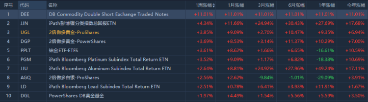 上周iPath彭博鎳分類指數總回報ETN $JJN 漲超4%,2倍做多黃金-ProShares $UGL 漲近4%,鉑金ETF-ETFS $PPLT 漲超3%。
