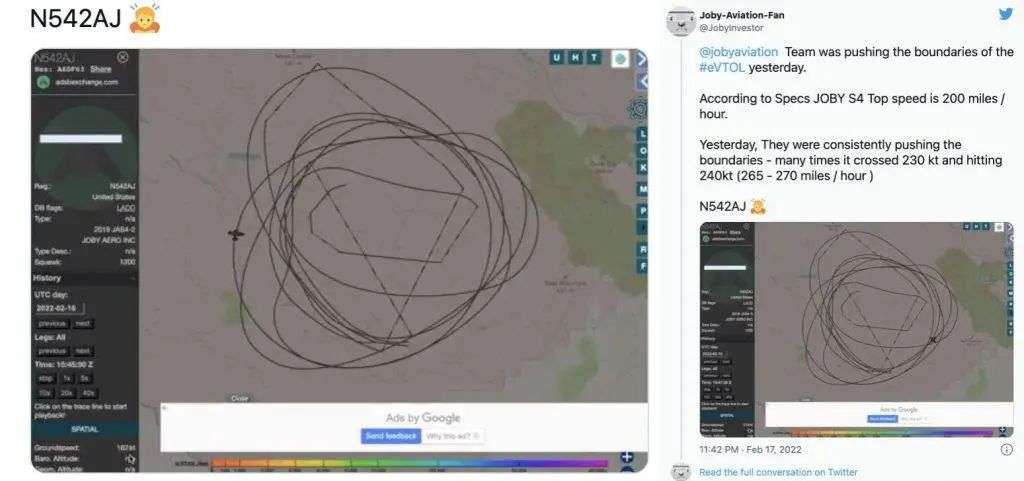 雖然目前 Joby 公司並沒有透露關於事故的更多信息,但據網絡上有人進行的飛行數據分析來看,發生事故的飛機應該是一架尾號為 N542AJ 的 Joby 原型機,是獲得 FAA (美國聯邦航空管理局)特別適航證和美國空軍適航證的兩架預生產原型機之一。