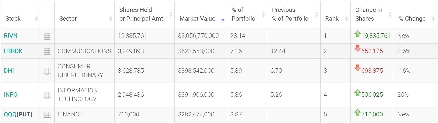 此外,貝萊德、小摩、德意志銀行、索羅斯旗下基金Soros Fund Management、大摩、黑石集團和高盛等知名機構紛紛在第四季度建倉Rivian。意外的是,Rivian直接躍升爲索羅斯基金第一大重倉股。該基金約持有1983.57萬股Rivian,市值約20.57億美元,佔投資組合比例為28.14%。
