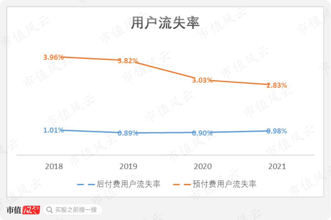 即使公司近年來預付費用户流失率不斷下降,但2021年,預付費用户的流失率仍較后付費用户高出近1.8個百分點,分別為2.8%和1.0%。
