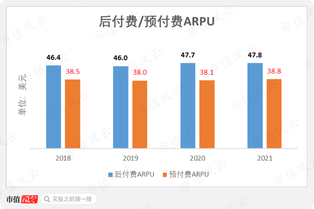 以公司為例,據披露,2021年,公司后付費用户的月均ARPU為47.8美元,而預付費用户的月均ARPU只有38.8美元。