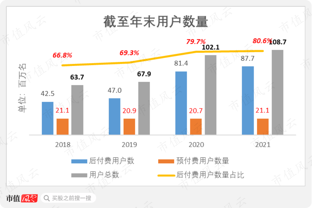 截至2021年末,公司約1.1億名用户中,有8770萬名為后付費用户,佔比高達81%。