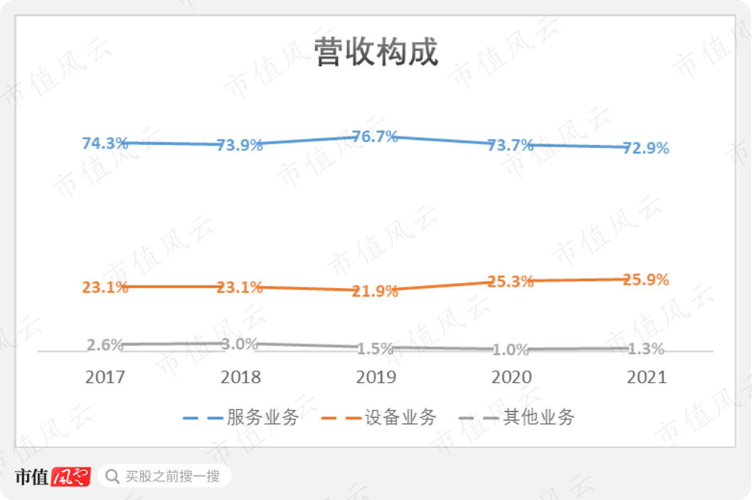 2021年,服務業務和設備業務的營收佔比分別為73%和26%。