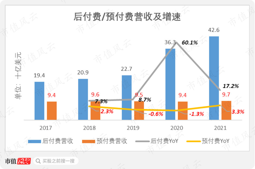 2021年,公司后付費營收426億美元,同比增長17.2%;預付費營收97億美元,同比增長3.3%。