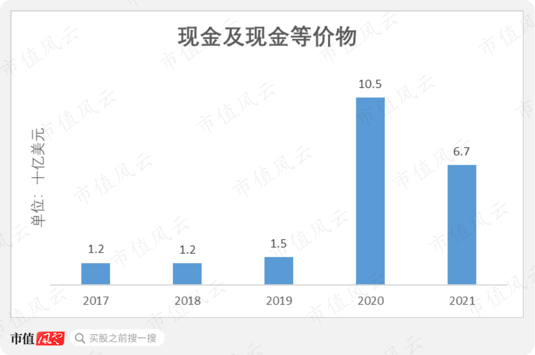 截至2021年末,公司賬面上的現金及現金等價物尚有67億美元,較去年同期的105億美元減少了36%。