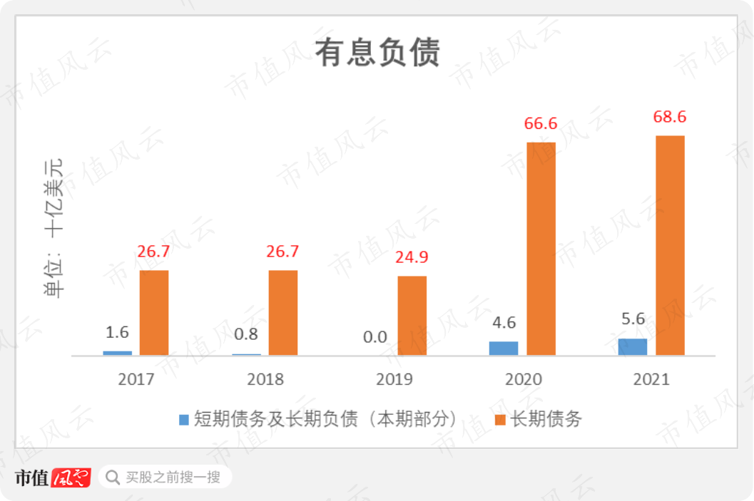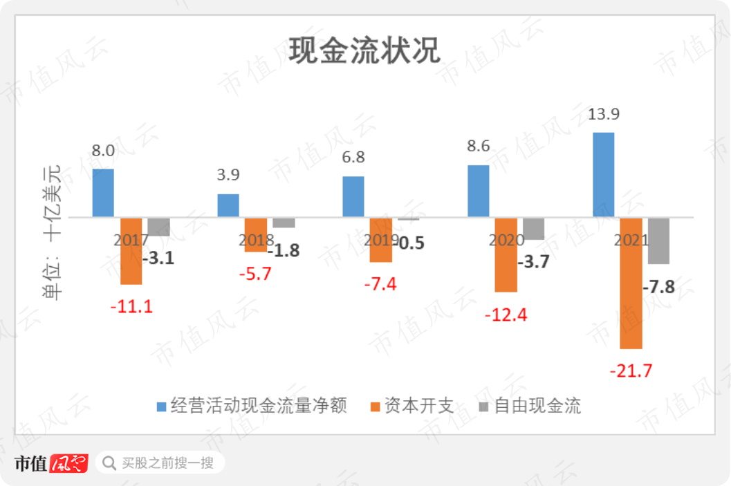 龐大的資本開支使其自由現金流長期為負。2021年,公司自由現金流的缺口達到78億美元。