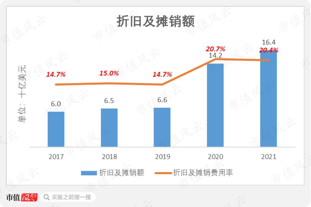 但合併業務后,公司每年的折舊及攤銷額明顯增長。2020-2021年,公司的折舊及攤銷費用率在20%以上,遠高於合併前的15%。