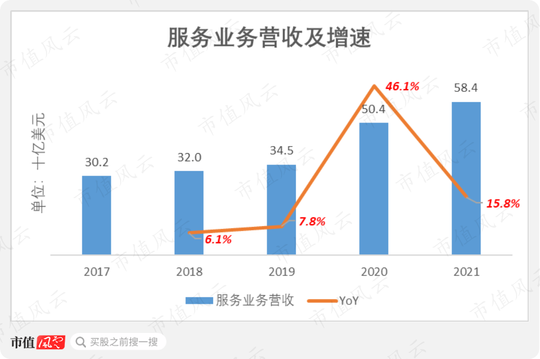 2021年,公司服務業務營收584億美元,同比增長15.8%。