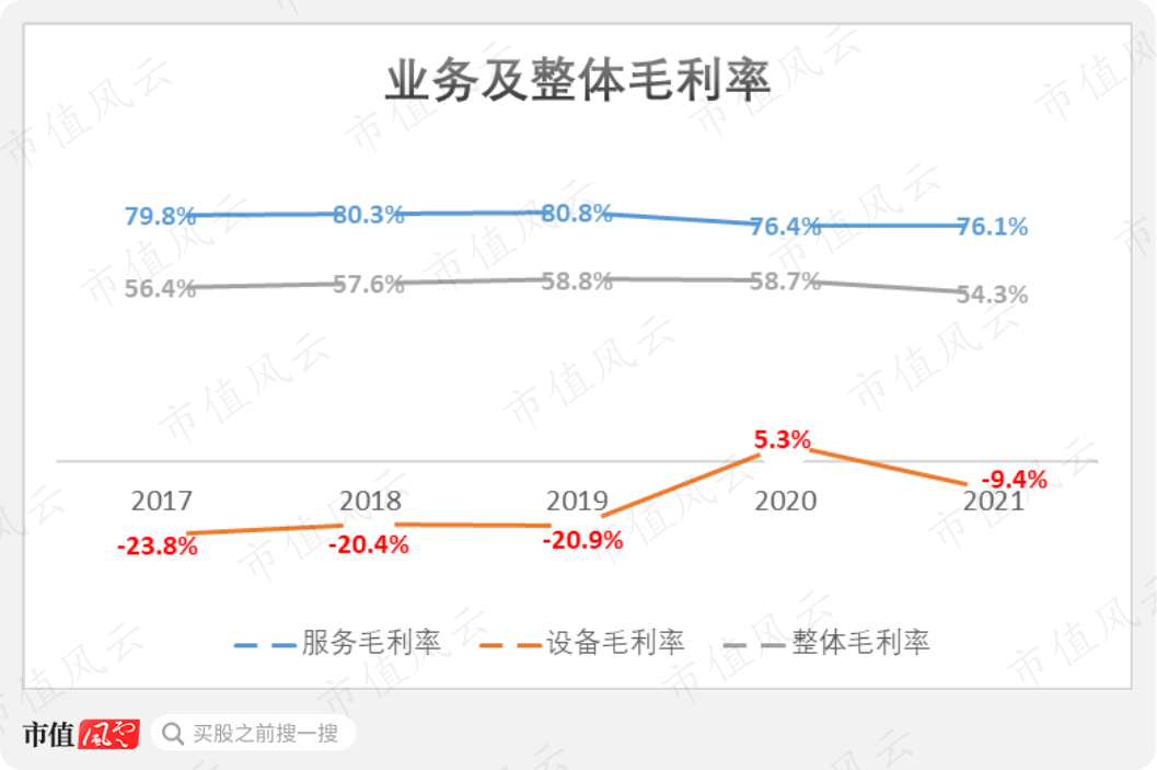 2021年,公司的服務毛利率、設備毛利率和整體毛利率分別為76.1%、-9.4%和54.3%。