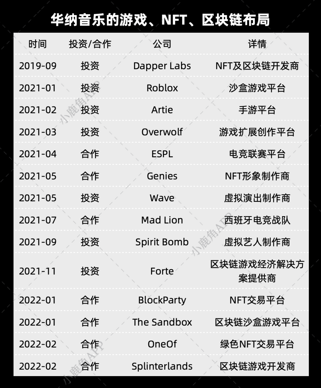 這一系列的佈局首先從區塊鏈遊戲的技術層面為起點,2021年11月,華納音樂投資了區塊鏈遊戲經濟的解決方案提供商Forte。后者能夠幫助遊戲開發商搭建經濟系統以及打造NFT。從技術層面出發,能夠幫助華納音樂快速深入區塊鏈領域。