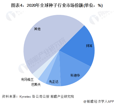 在市佔率方面,根據Kynetec統計的市場規模以及各公司公報數據,2020年,全球種子行業市場中,排名前幾位的公司依次為拜耳、科迪華、先正達集團、巴斯夫、Vilmorin,市場份額依次為20%、16.8%、6.9%、4%以及3.4%。