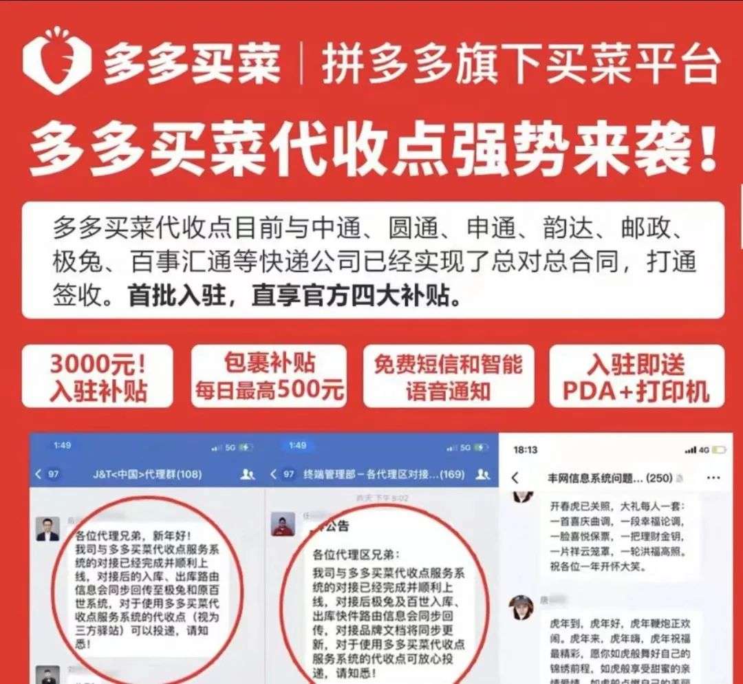 流傳在某快遞網點社羣中的一份宣傳資料顯示,「多多買菜代收點目前已與中通、圓通、申通、韻達、郵政、極兔、百世匯通等快遞公司簽署合作協議,打通簽收系統」。