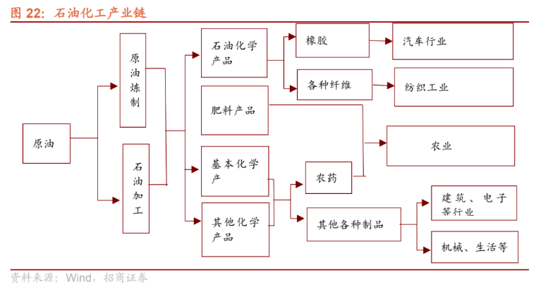 根據工業生產流程,原油產業鏈一般包括:原油開採—煉油—化學工業—紡織、機械行業。原油價格隨着產業鏈逐漸傳導,同時從上游到下游隨着行業集中度的降低,價格傳導作用逐漸減弱。