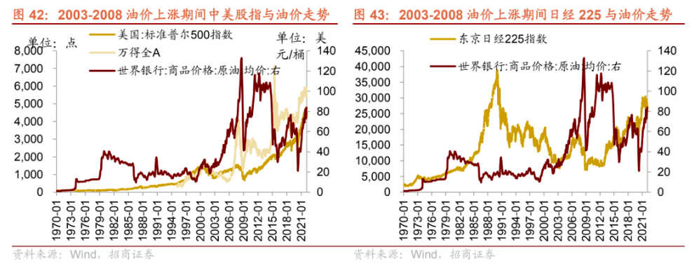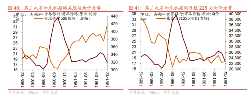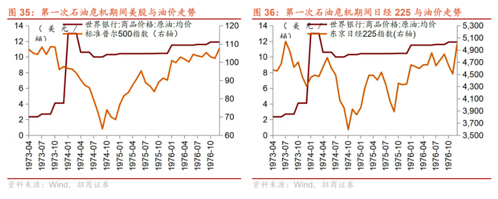 2、股指層面。對應到相應期間的股指變動:第一次石油危機期間,以OPEC的兩次提價為界限,標普500和日經225均有兩輪的大幅下跌。