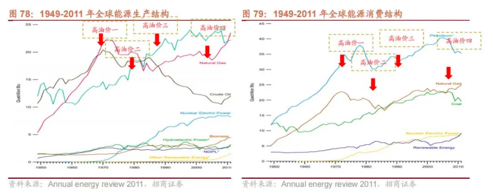 3、能源結構:幾次高油價使得原油在全球能源消費生產中佔比逐漸降低,天然氣、煤炭、核能等佔比逐漸提升。