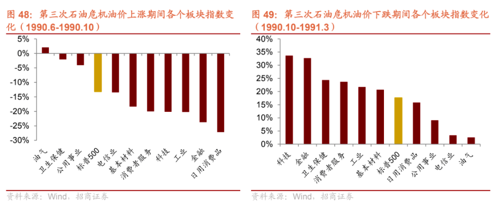 報告顯示,考察各板塊在油價上漲與下跌階段的表現可以發現,消費者服務、金融、工業等與油價有因果關係的行業在三次石油危機期間波動較大。