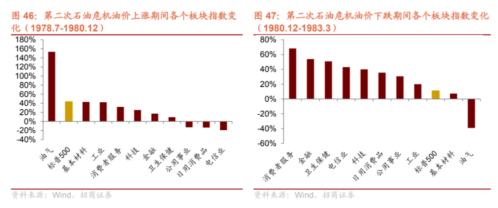 第二次石油危機油價上漲期間(1978年7月至1980年12月),基本材料、工業等行業指數有所上漲,油價下跌期間,金融行業、衞生保健行業和電信有較大幅度的上漲。