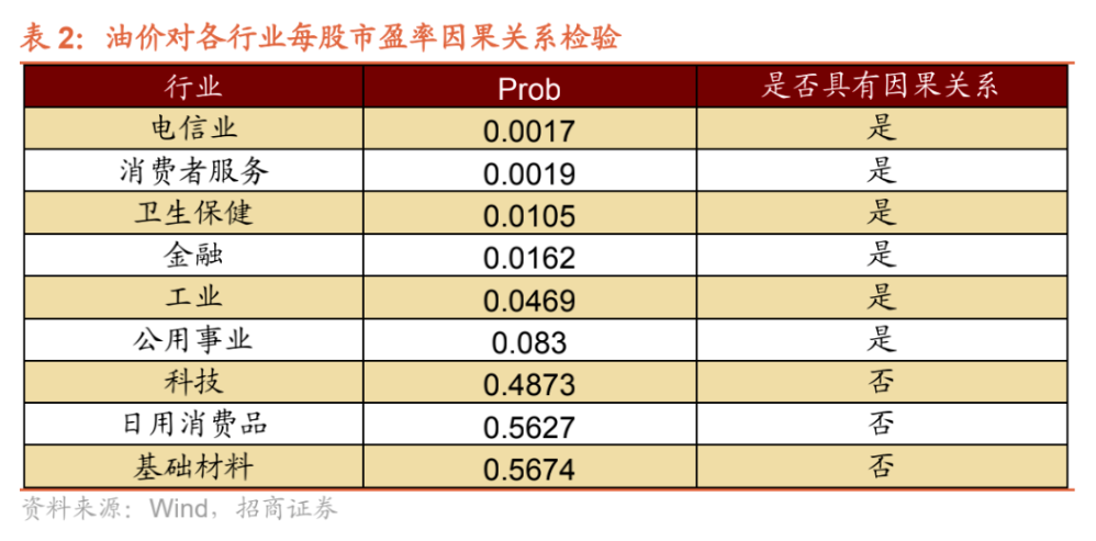 3、各個板塊表現。該報告選取三次石油危機期間(1973年1月至1991年12月)世界原油均價與各個一級行業每股市盈率的月度數據,取對數,差分調整之后,得到如下因果檢驗結果。