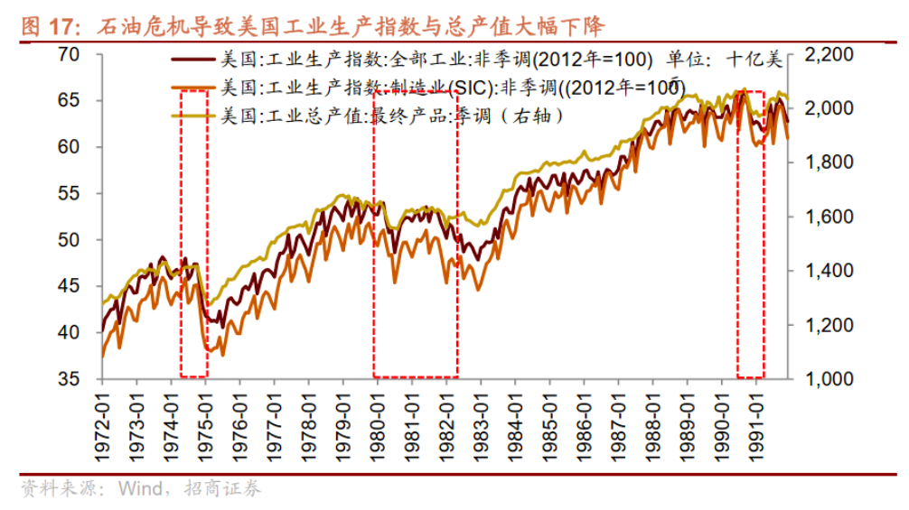 在前述三次石油危機期間,美國工業總產值均出現下滑。其中,第一次石油危機期間下滑程度最大,工業總產值從1973年10月的1.46萬億美元降到1975年6月的1.31萬億美元,降幅達8%。
