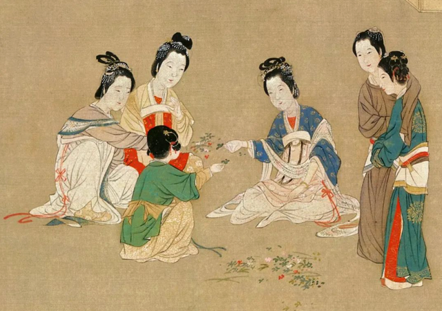 《漢宮春曉圖》,傳為明代仇英所繪。本圖中截取部分為宮女玩鬥草遊戲的情景。李白《清平調》中所述「百草巧求花下鬥,只賭珠璣滿鬥」。明人《看山閣閒筆》雲「踏青鬥草,佳人韻事。手提筠籃,各求異草,團坐於碧蒲席上,卷羅袖,出春纖從容鬥之,不覺草薰人韻,笑語生風」,即此之謂也。