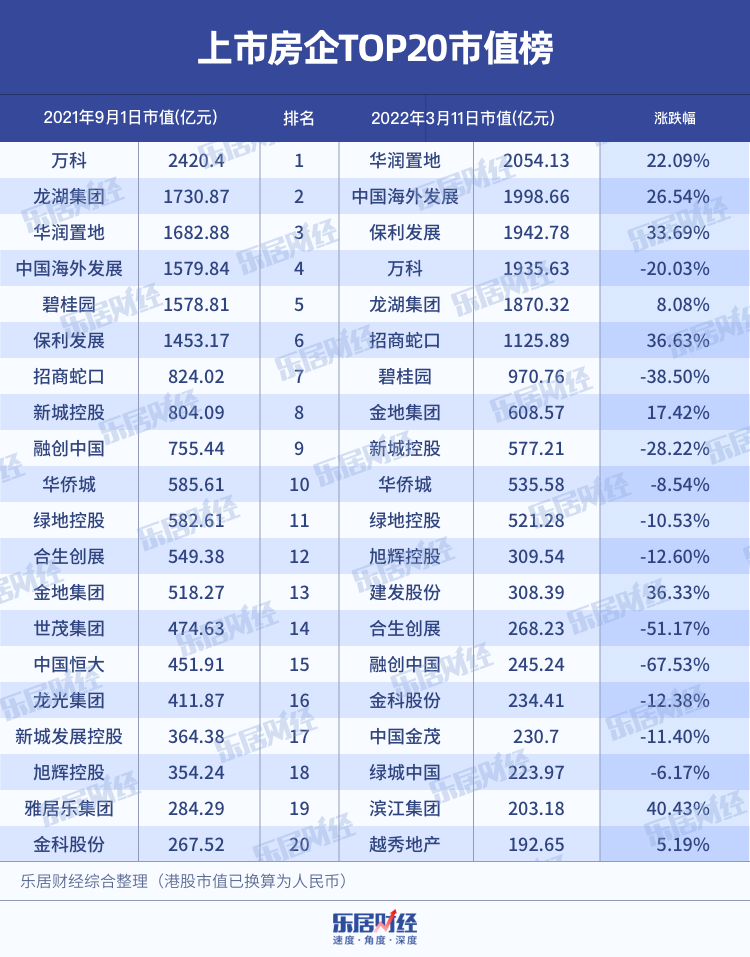 去年九月之際,萬科以2420.4億元的市值位列第一,在其身后,龍湖、華潤置地、中海、碧桂園、保利依次佔據着TOP2-6的位置,市值均超過了千億。再往后,招商蛇口、新城、融創、華僑城、綠地、龍光等,多方主體都擁有一席之地。