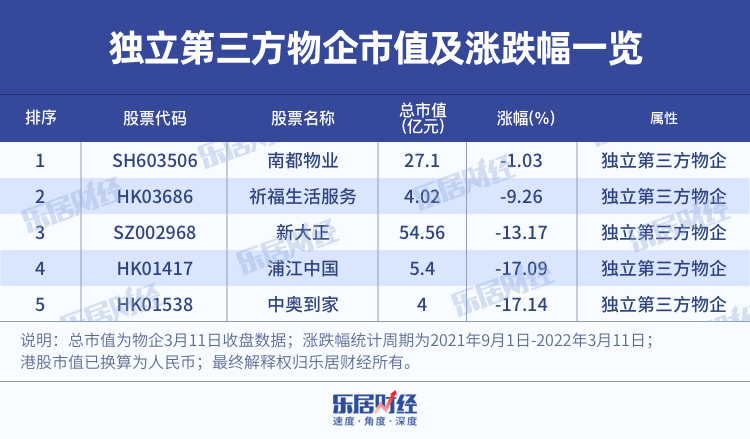 在這場地產寒冬之中,除了國資物企在股價上一定程度上保持了逆勢而行,還有5家沒有地產做靠山的獨立第三方物企,走出了「特立獨行」的步伐。它們在物業股整體走低的頹勢下,雖未能擺脫下挫的影響,但其平均11.54%跌幅依舊遠低於整體25%的跌勢。
