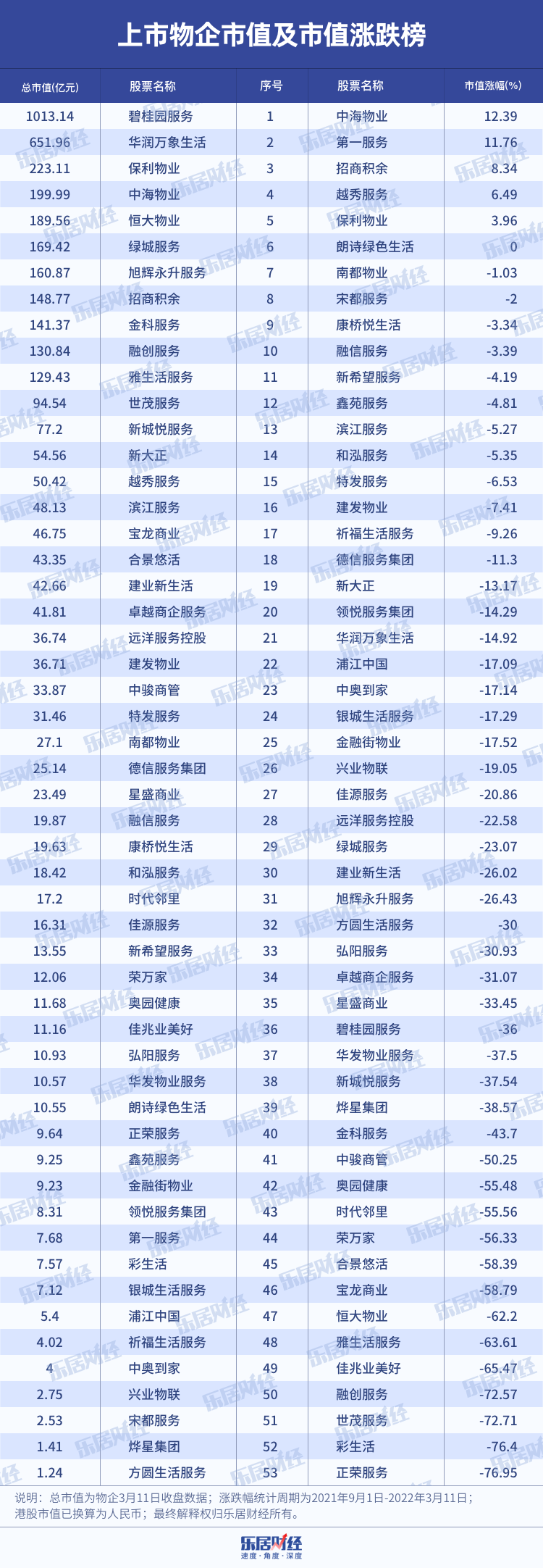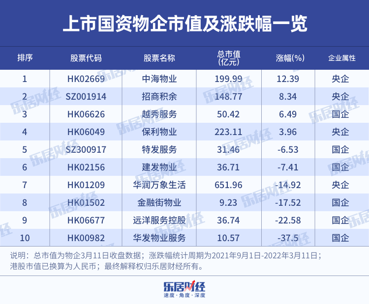 以53家上市物企為樣本,自去年9月1日至今年3月11日期間,僅6家物企市值保持正向增長或持平,其余47家物企均出現不同程度的下跌,平均跌幅達25%,反超地產板塊平均12.44%的跌幅。