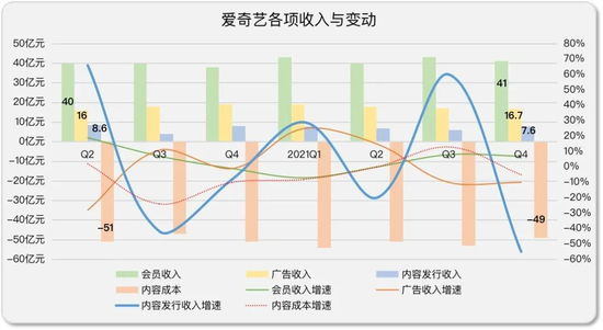 最近六個季度以來,愛奇藝的會員收入因為新增付費用户增長不佳、迫於壓力取消超前點映,導致數據表現並不好看。與此同時,廣告收入長期低迷不振,內容發行收入始終難堪大任。一旦佔據大頭的會員收入增速低於內容成本增速,那麼愛奇藝根本不可能在業績上有任何改觀。