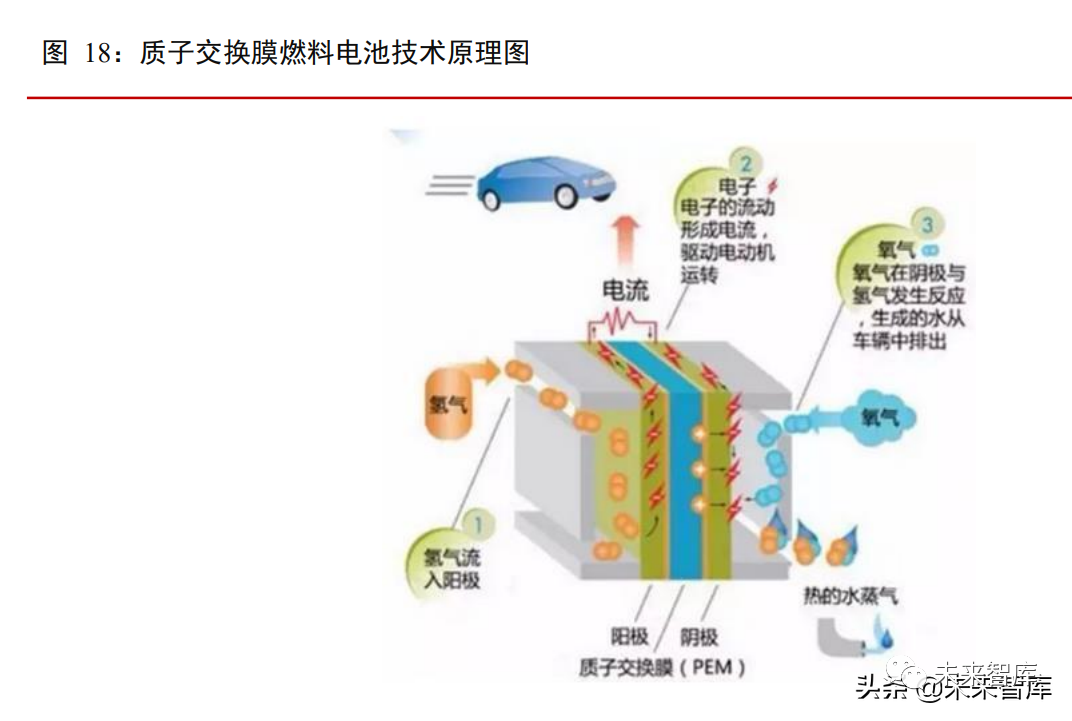 根據電解質類型的不同,燃料電池生產技術共分為 5 種。其中,質子交換膜燃料技術是繼鹼性、磷酸性以及熔融碳酸鹽以及固體氧化物燃料電池之后,迅速發展起來的温度最低,比能最高、啟動最快、壽命最長,應用最為廣泛的第五代燃料電池,也是現階段國際燃料電池汽車廠商普遍採用的燃料電池技術。