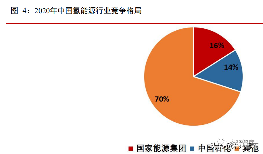 中國石化和國家能源集團是國內氫氣產量最大的兩家企業,2020 年,國家能源集團年生產 400 萬噸的氫氣,佔總體產量的 16%;中國石化氫氣年生產量達350 萬噸,佔全國氫氣產量的 14%。國家能源集團和中國石化兩家企業的市場份額佔據三成,其他氫氣生產企業數量多,氫氣生產規模相對較小,市場競爭格局較為分散。隨着其他大型央企進入氫能源行業,未來氫能源行業的市場集中度有望提升。
