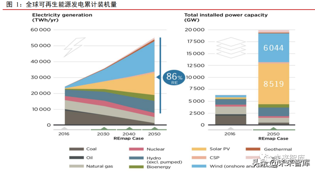 可再生能源規模化利用與常規能源的清潔低碳化將是能源發展的基本趨勢。加快發展可再生能源已成為全球能源轉型的主流方向。到 2025 年新建光伏項目的發電成本將較新建煤電低三成以上,在成本競爭優勢的推動下,全球光伏發電量在總發電量中的佔比將從 2018 年的 2.4%提高到 2050 年的 24%水平,屆時全球能源供給將全面開啟「太陽能時代」。根據國際可再生能源機構(IRENA)發佈的《全球能源轉型:2050 路線圖(2019年版)》的預測數據,2050 年全球光伏裝機量將達到 8519GW。