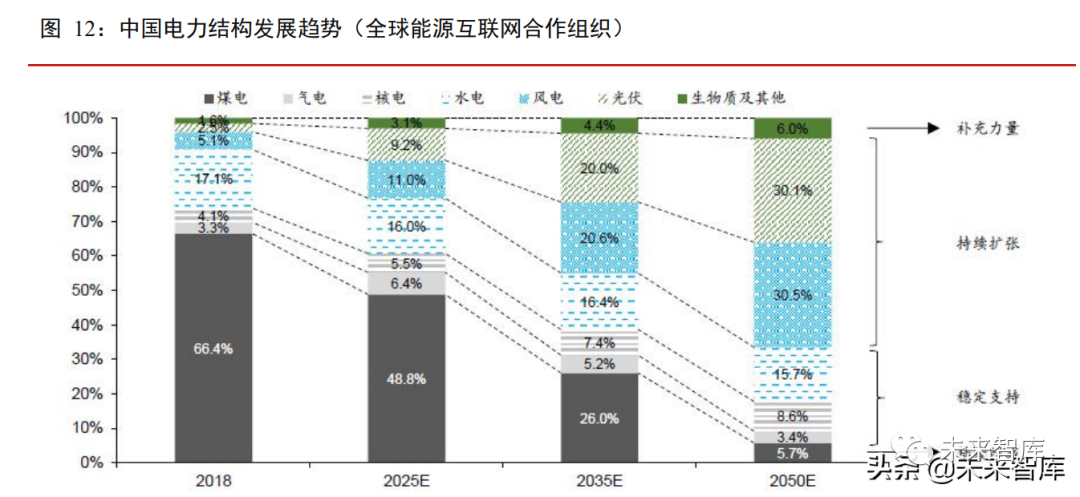 現階段我國發電結構仍以化石燃料發電為主,根據全球能源互聯網合作組織測算,到 2025 年,中國發電結構中,煤炭佔比將從 67%下降至49%,風光發電佔比將從8%上升至 20%;到 2050 年,煤炭發電佔比大幅下降至 6%,風光發電上升爲主力,合計佔比66%。隨着可再生能源發電成本不斷降低,發電佔比逐步提升,疊加核心設備的進一步國產化,將極大帶動可再生能源電解水制氫方式的發展。(報告來源:未來智庫)