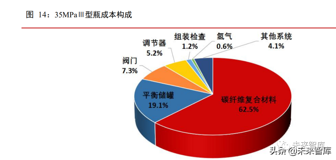 目前已商業化應用的高壓儲氫氣瓶主要是 I 型瓶、II 型瓶、III 型瓶和IV型瓶。I 型瓶由金屬鋼組成;II 型瓶採用金屬材質為主,外層纏繞玻璃纖維複合材料;III 型瓶、IV型瓶外部採用碳纖維纏繞,III 型瓶內膽為金屬,IV 型內膽為塑料。國內目前應用較多的是 35MPa 儲氫Ⅲ型瓶,碳纖維複合材料是核心組成部分,但是由於國內的碳纖維以進口為主,2020 年中國碳纖維的進口量佔需求量的6 成左右,碳纖維複合材料成本約佔 35MPa 儲氫Ⅲ型瓶生產成本的 62.5%。